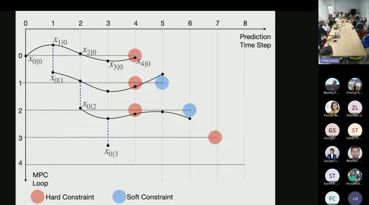 Second, I will present a novel Model Predictive Control scheme that can guarantee recursive feasibility and/or safety under weaker assumptions than classic methods. In particular, recursive feasibility is guaranteed by making the safe-set constraint move backward over the horizon, and assuming that such set satisfies a condition that is weaker than control invariance. Safety is instead guaranteed under an even weaker assumption on the safe set, triggering a safe task-abortion strategy whenever a risk of constraint violation is detected. We evaluated our approach on a simulated robot manipulator, empirically demonstrating that it leads to less constraint violations than state-of-the-art approaches, while retaining good performance in terms of tracking cost, number of completed tasks, and computation times.